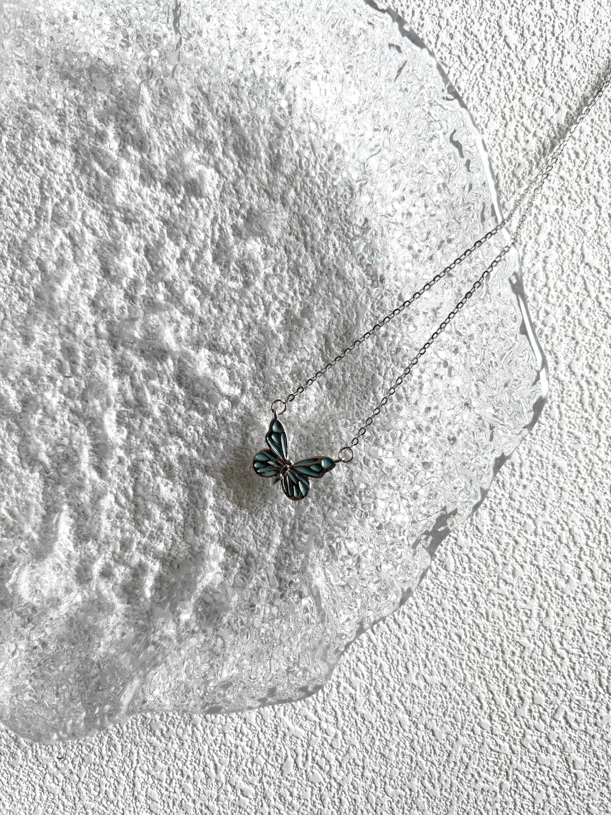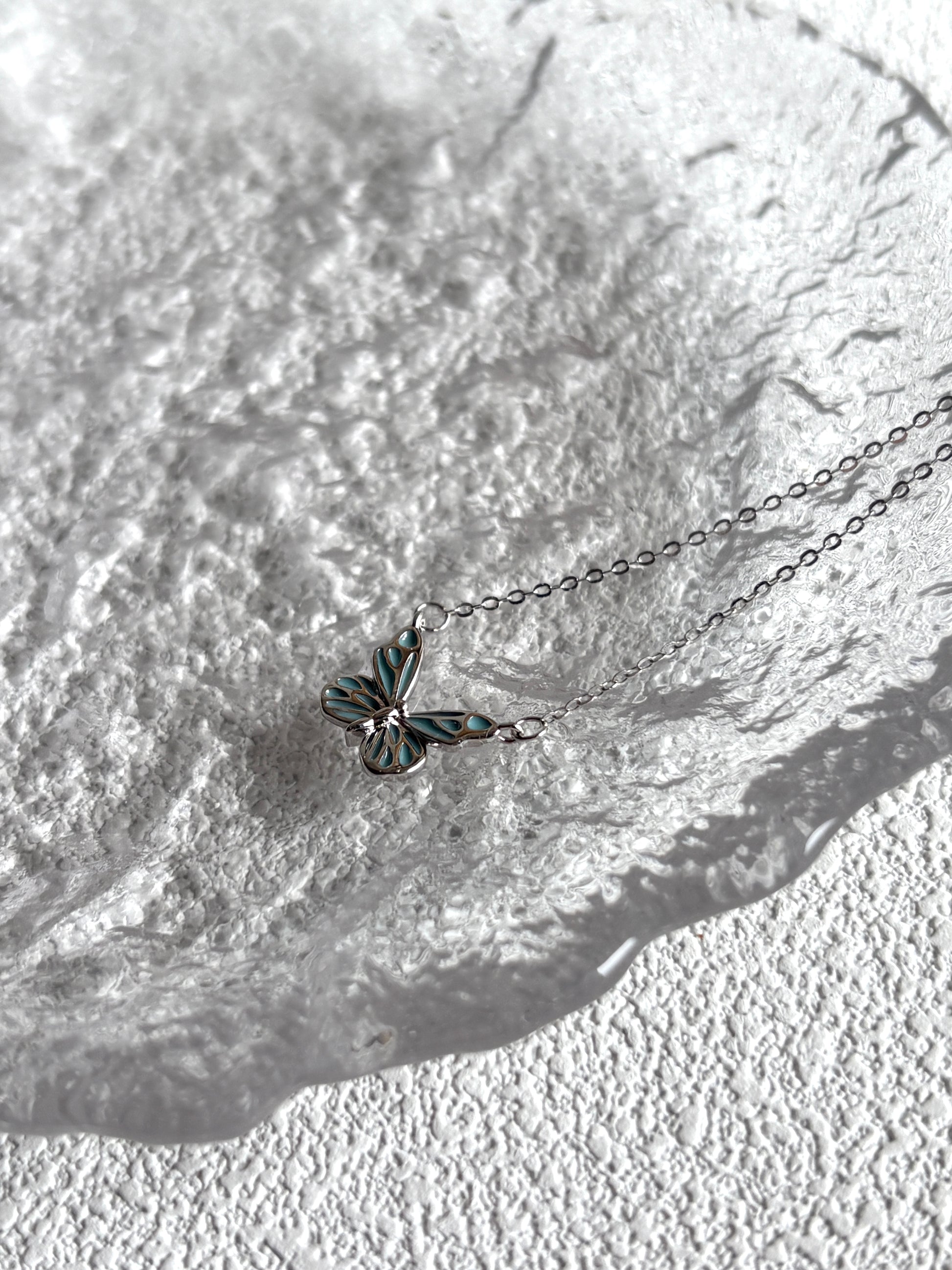 A delicate butterfly pendant outlined in polished silver‑tone metal with sky‑blue enamel accents. The inlay absorbs light by day and glows softly after dark, creating a magical, luminous effect. Suspended from a slender cable chain, it adds a cheerful pop of color in daylight and a dreamy glow at night—lovely solo or layered.