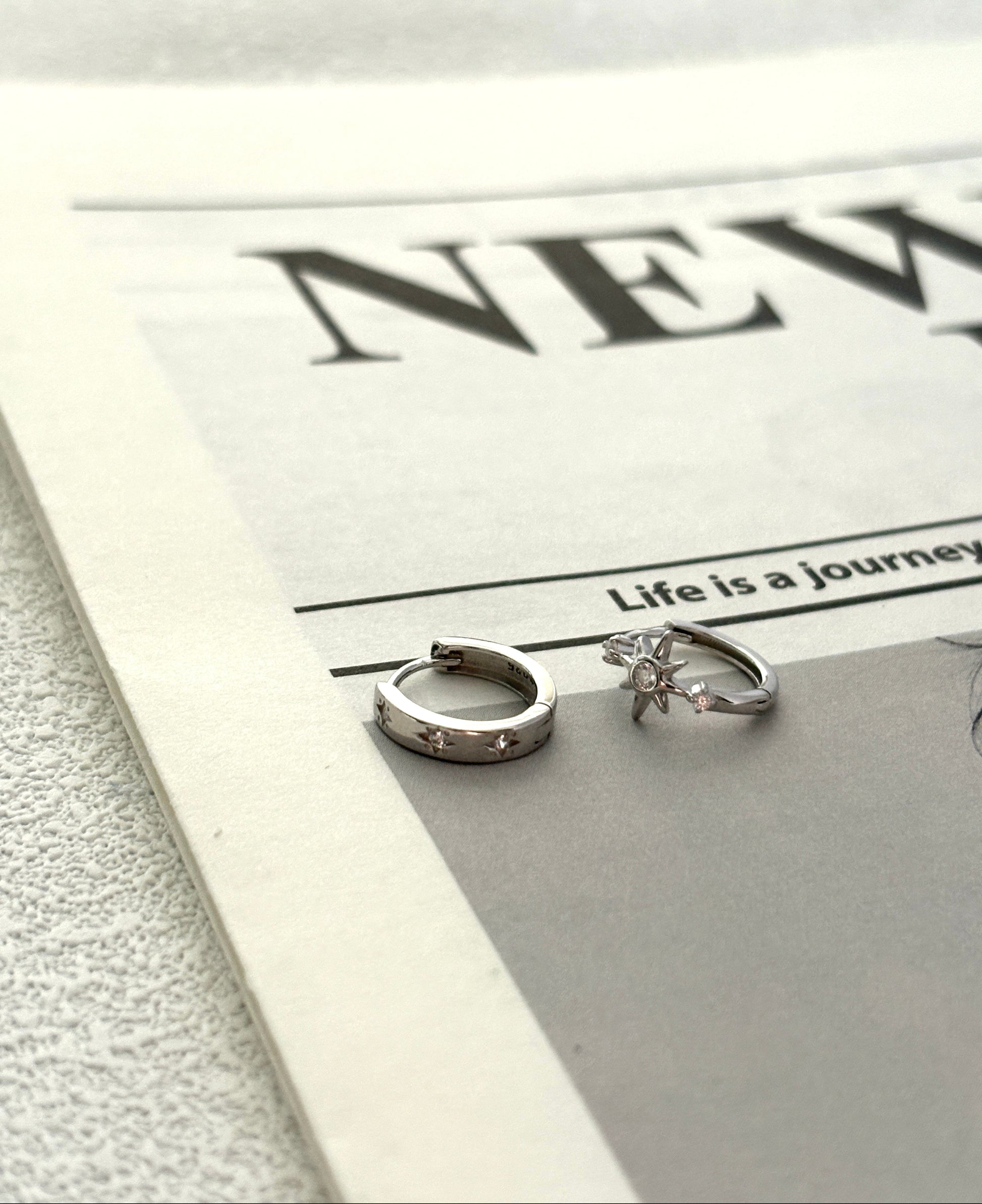 A little night‑sky sparkle for every day. These compact huggie hoops feature a north‑star centerpiece with a bright bezel‑set stone, plus petite pavé accents. Hidden hinge, soft click closure—no separate backs—for easy, comfy wear. *Sold as one pair; styled as a mismatched look.