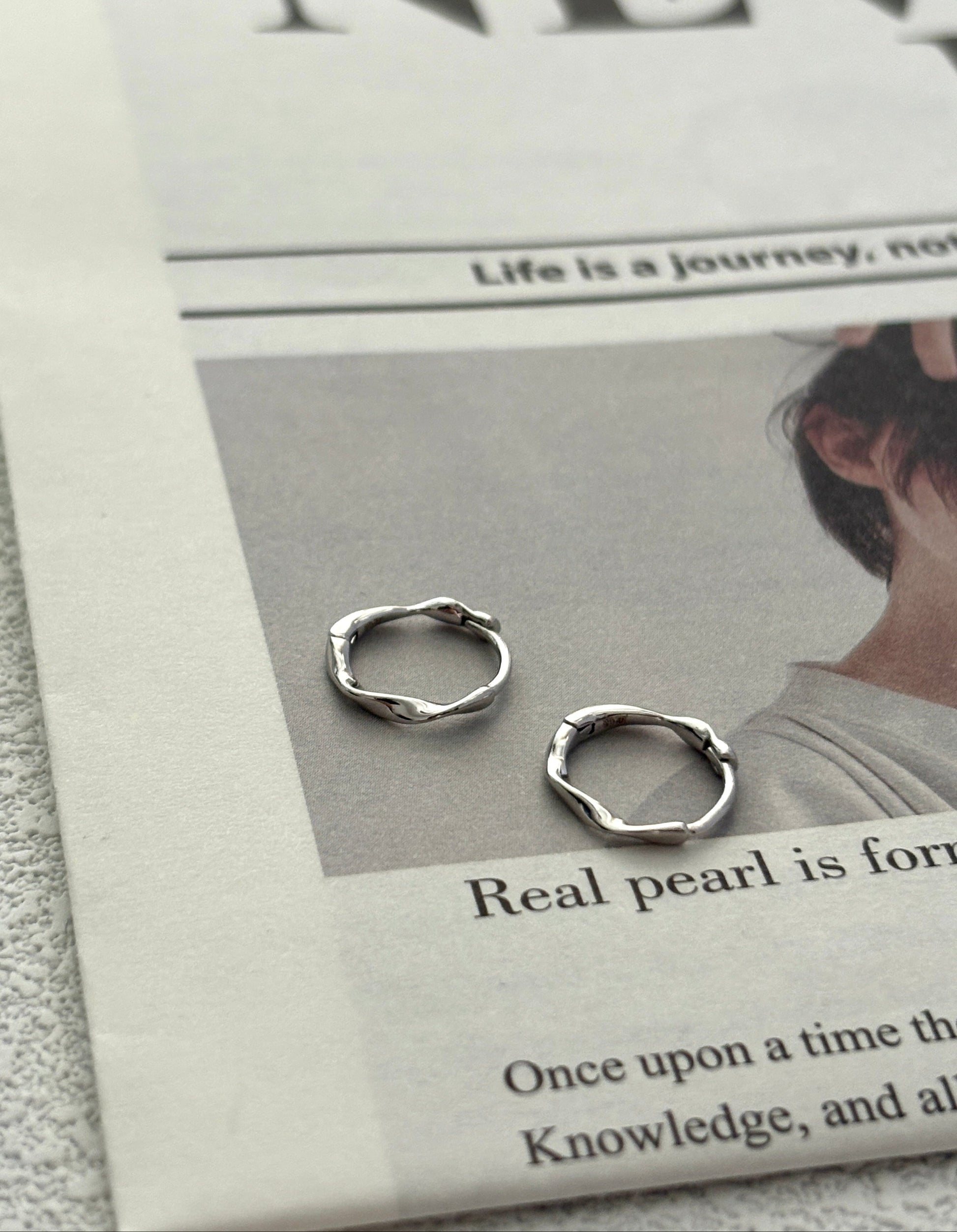 These huggies echo the look of liquid metal with soft, organic ripples. Minimal yet distinctive, they’re mirror‑polished for a clean shine and designed to stack effortlessly for everyday wear.