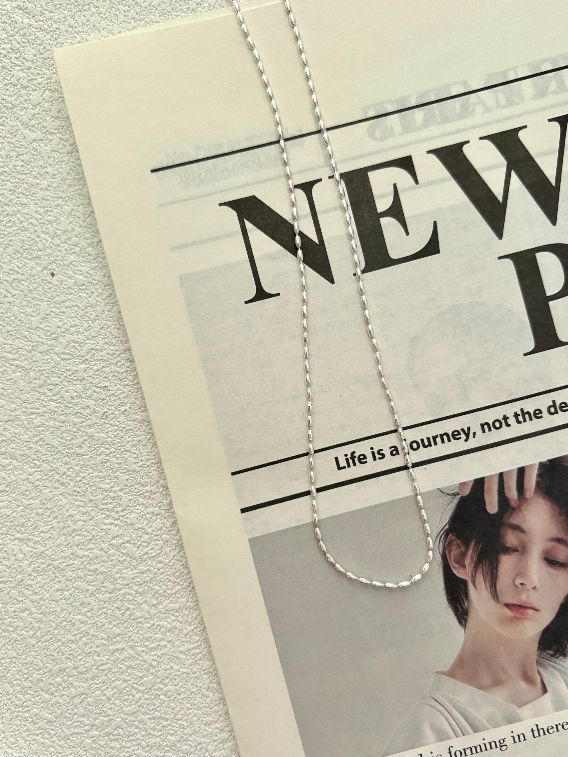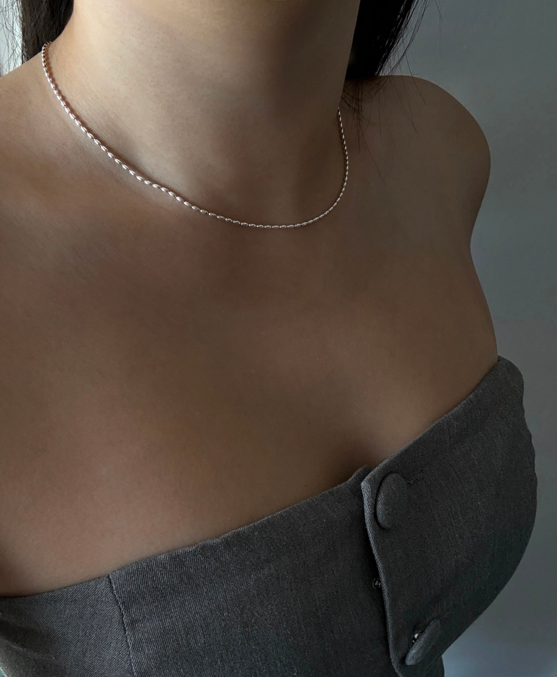 A sleek strand of polished rice beads crafted in solid sterling silver. The beads catch the light for a soft, liquid shine and lay flat for effortless, everyday wear.