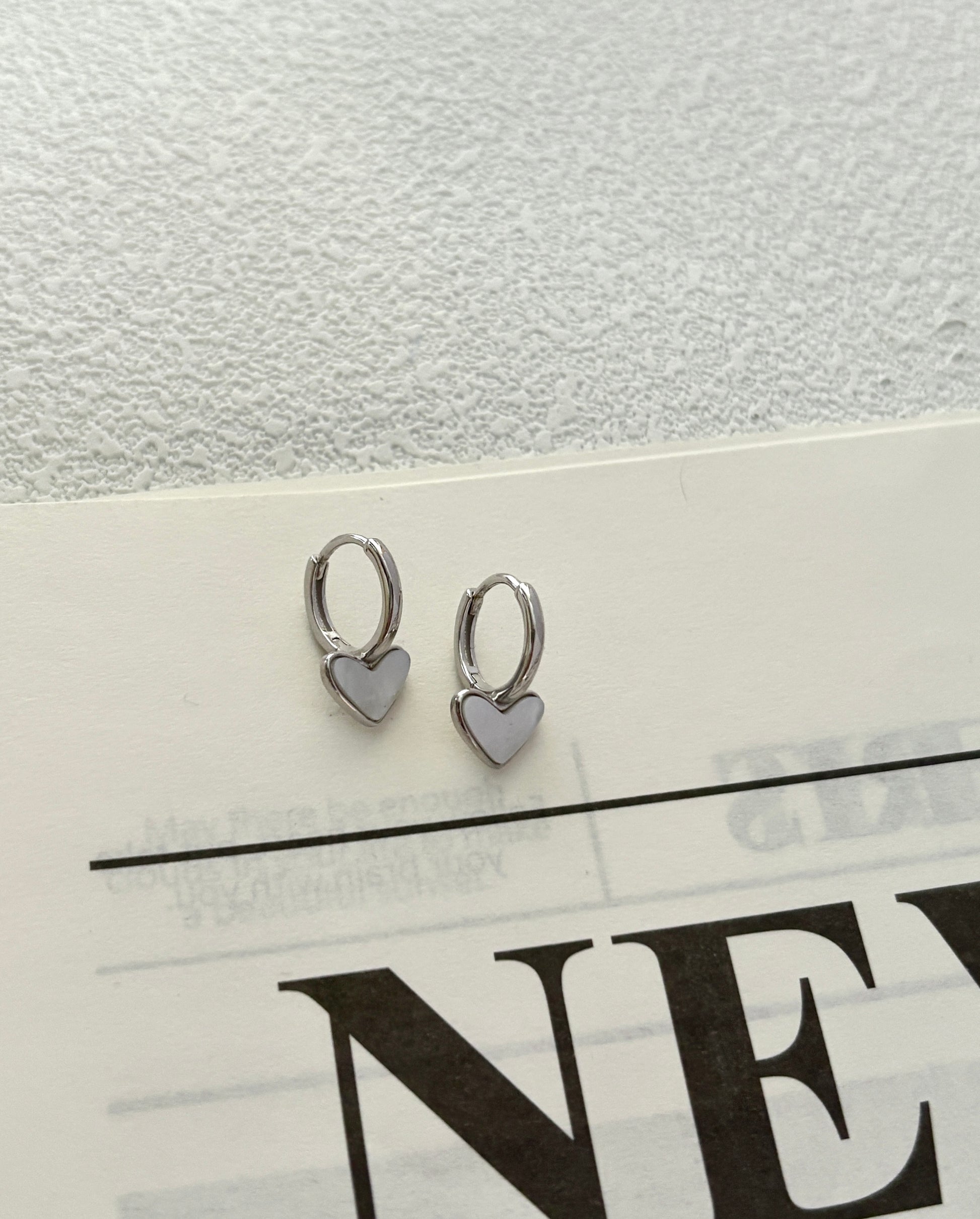 Petite heart charms softly glow with iridescent mother‑of‑pearl, framed by sleek, mirror‑polished silver huggie hoops. Delicate, feminine, and easy to style, they bring a touch of romance to everyday looks—perfect worn solo or stacked.
