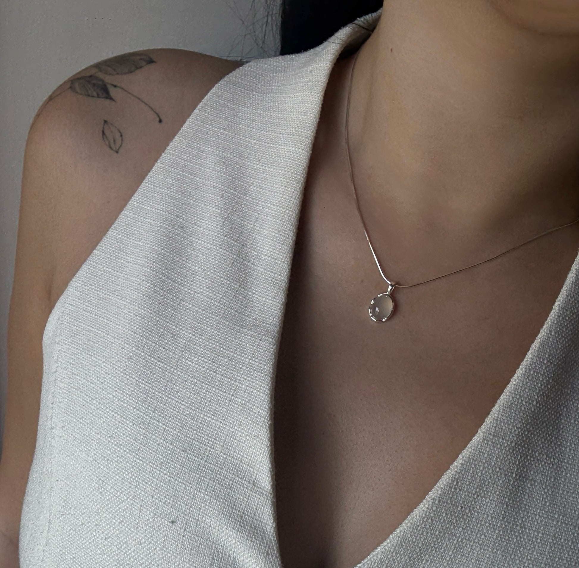 A softly glowing agate cabochon rests in a delicate scalloped bezel, suspended from a sleek silver‑tone herringbone chain. Minimal and refined, it lays flat against the collarbone for a smooth, mirror‑like shimmer—perfect worn solo or layered for everyday elegance.