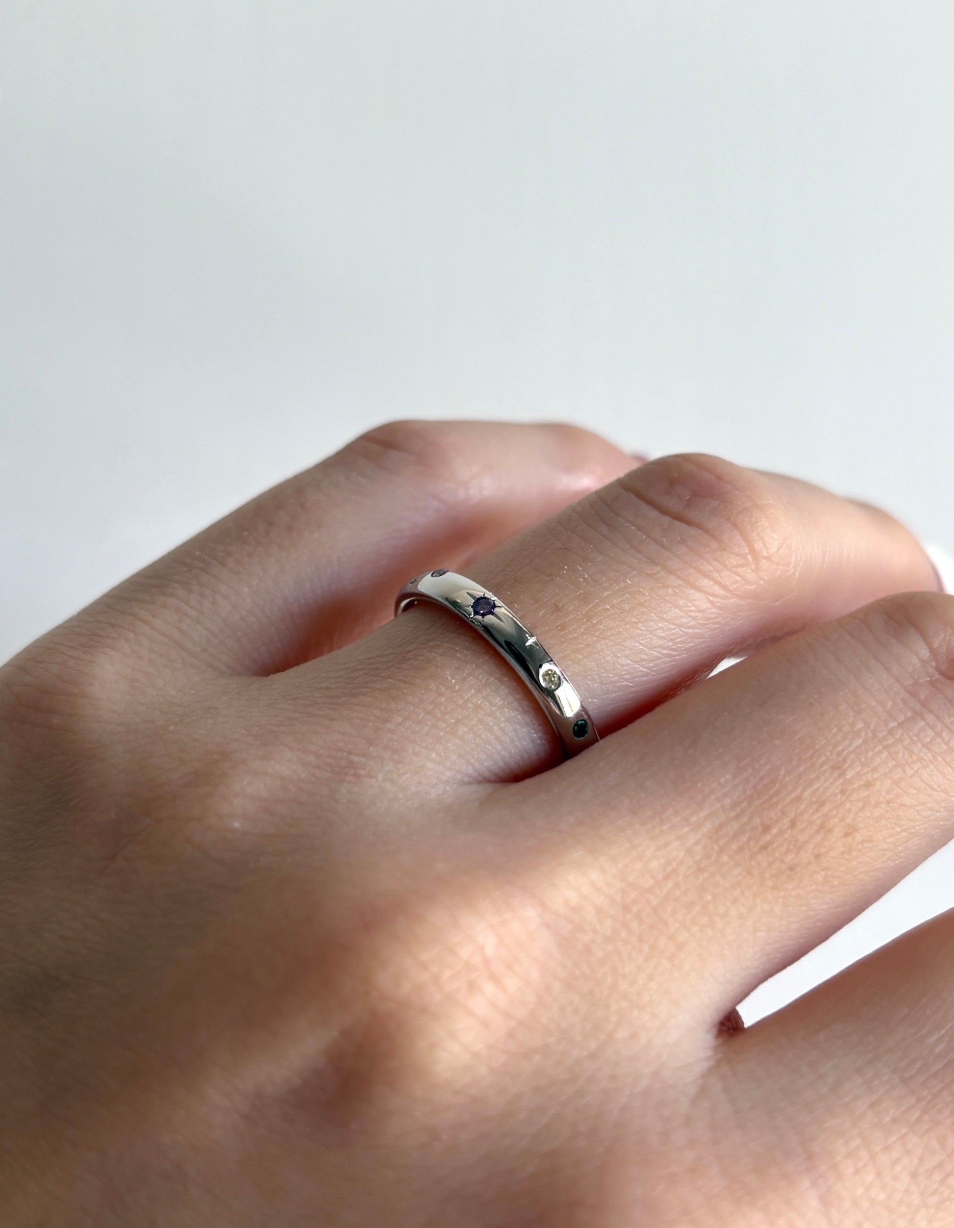 簡約閃耀,星光點綴。一枚銀戒指,鑲嵌著璀璨的彩色寶石,戒圈上點綴著一顆八角星。纖薄、光滑、閃耀——無論單獨佩戴或疊戴都格外出色。