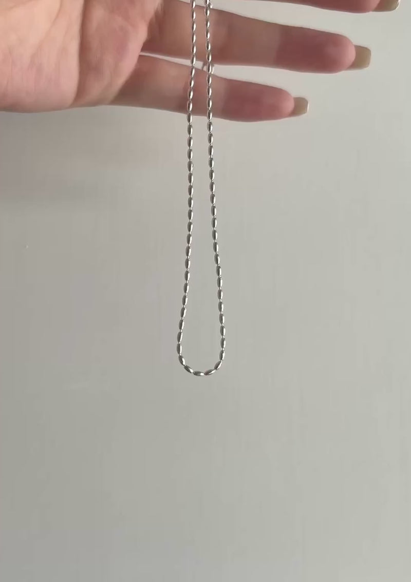 一串光滑的拋光米珠,以純銀打造而成。珠子在光線下散發柔和的光澤,平放於地面,方便日常佩戴。