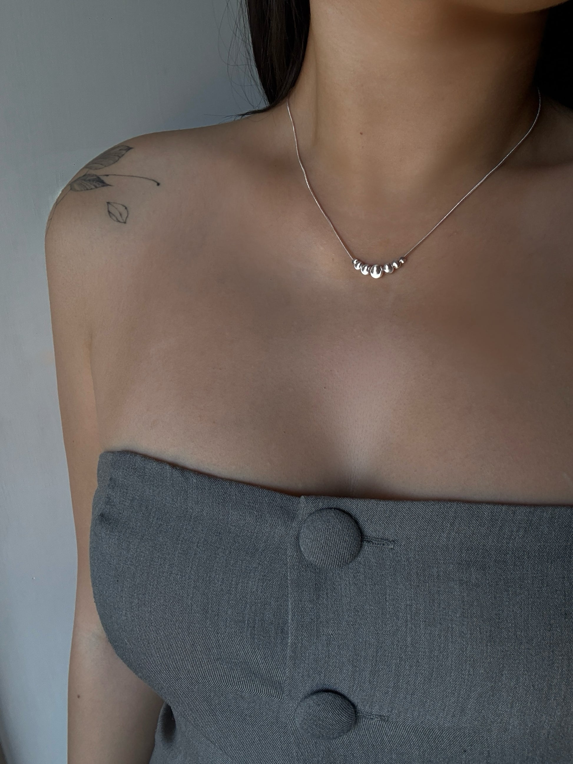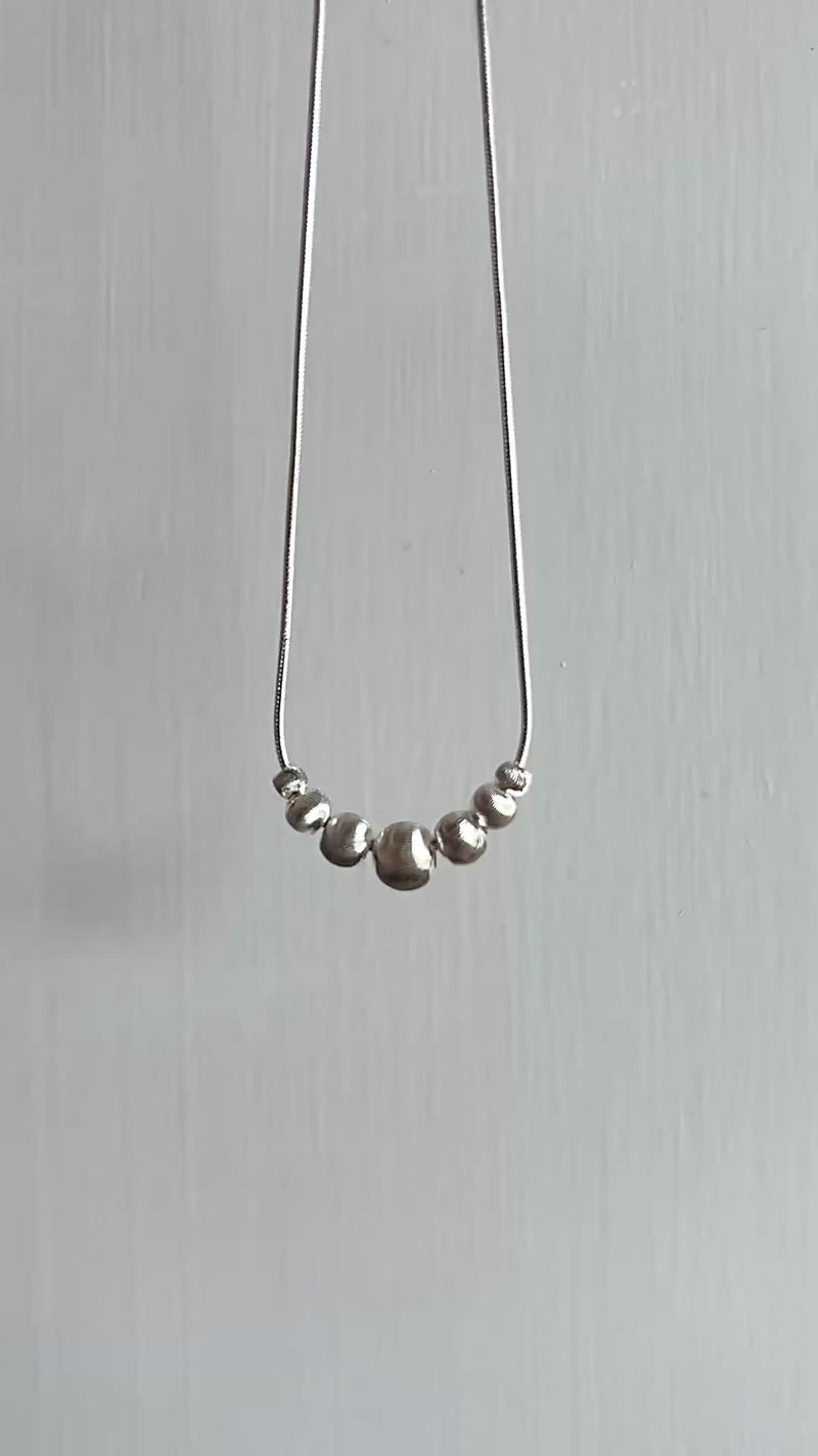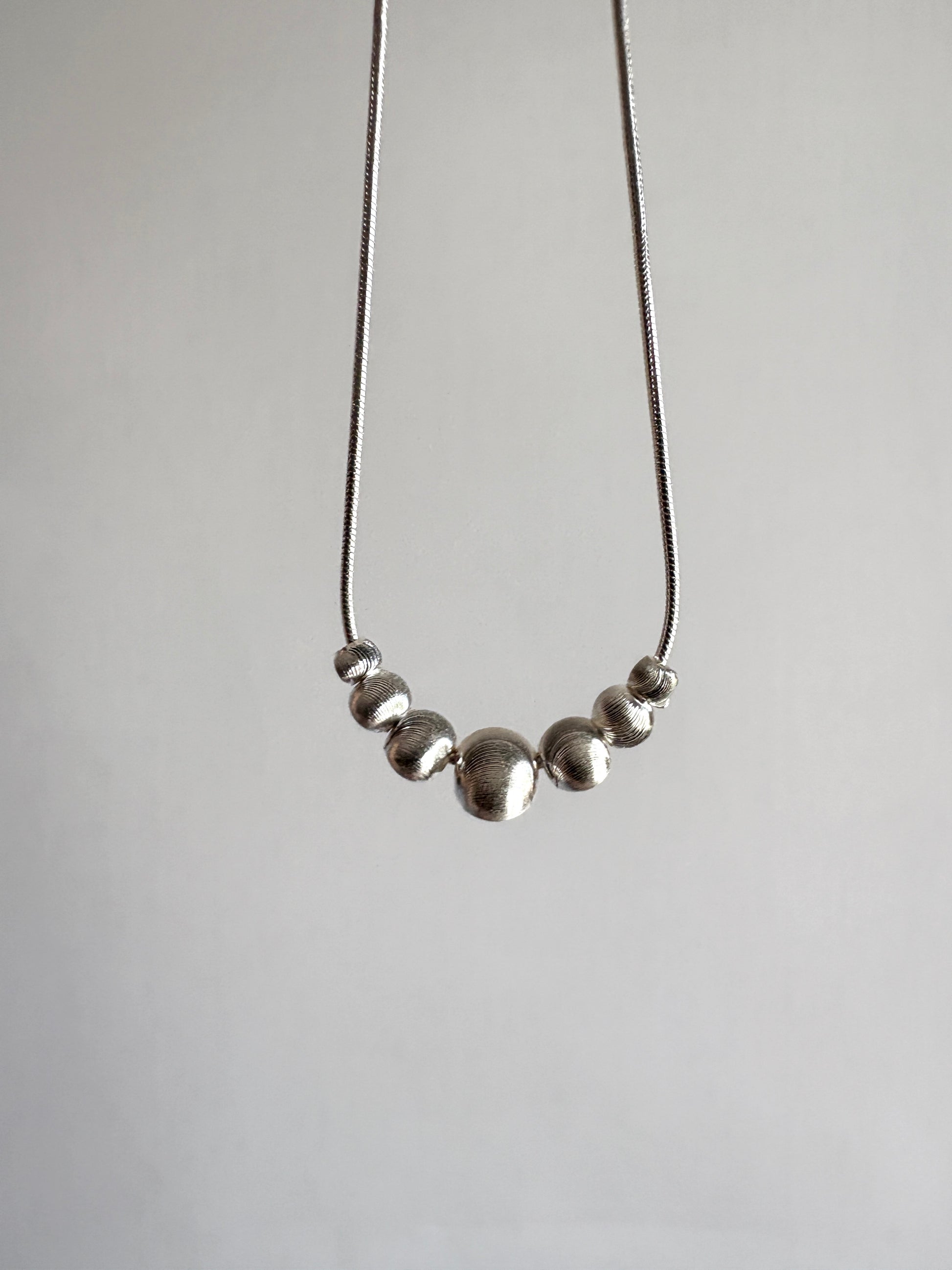 優雅精緻,低調奢華。精緻的銀蛇形鏈上,串綴著一排光滑如鵝卵石的珠子,珠子大小從小到大,層次分明。鏈條散發著水潤光澤,打造簡潔現代的造型-日常配戴輕鬆自在,晚間配戴精緻優雅,無論單獨配戴或疊戴都美不勝收。