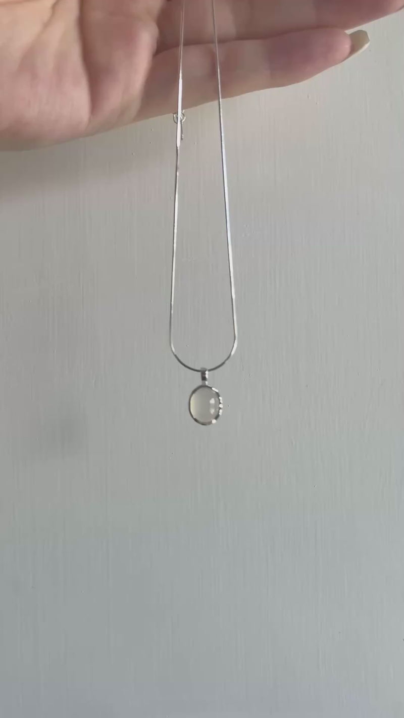 一顆散發柔和光澤的瑪瑙凸圓形寶石鑲嵌於精緻的扇貝形錶圈中,懸掛於一條光滑的銀色人字形鏈條上。簡約精緻,它平整地貼合鎖骨,散發出如鏡般柔滑的光澤——無論是單獨佩戴還是層疊佩戴,都能展現日常優雅氣質。