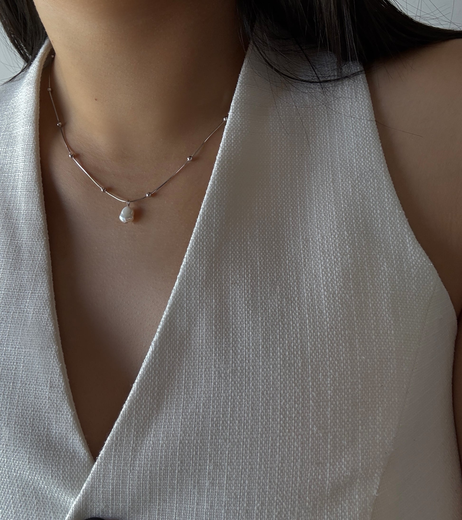 這款項鍊將天然巴洛克珍珠吊墜與銀鍊巧妙融合,宛如液態金屬般垂墜。拋光珠飾增添微妙的閃耀,天然珍珠則散發出柔和的海洋光澤。日常配戴輕鬆自在,晚間配戴優雅優雅。